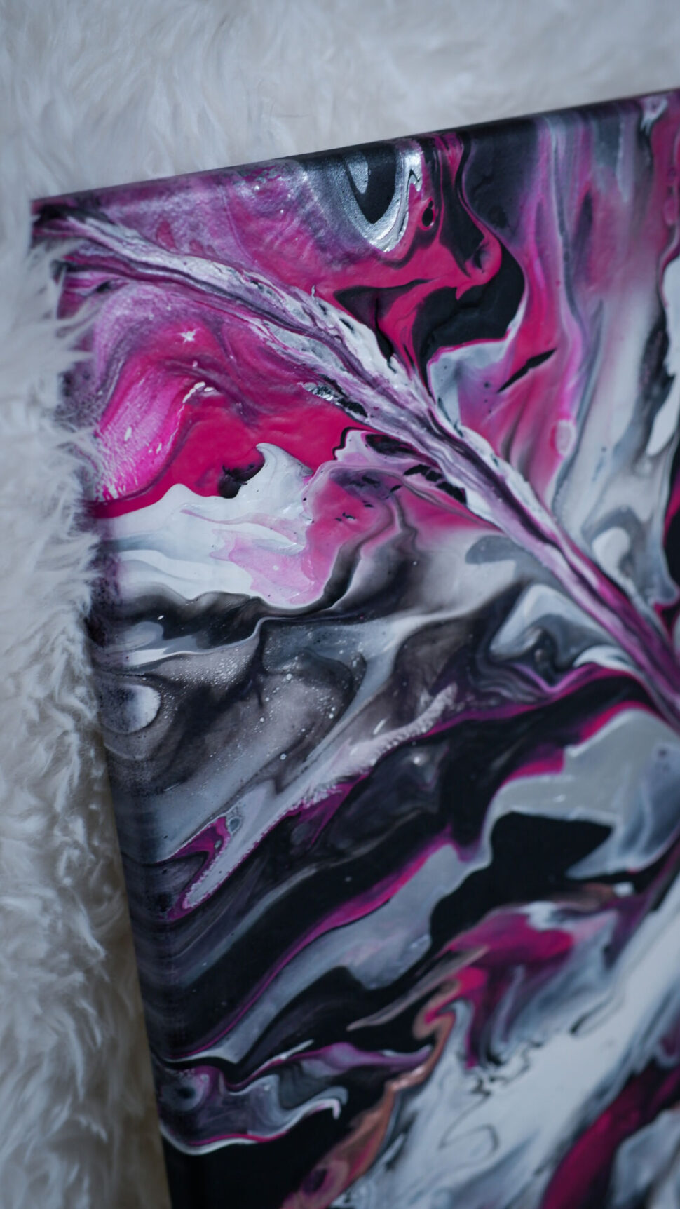 Velikost obrazu je 40 x 40 cm. Je tvořen technikou pouring, tedy litím akrylových barev na bavlněné plátno, které je napnuto na dřevěném rámu. Na závěr je použitý fixační bezbarvý lak s UV ochranou. K horní části obrazu je zezadu připevněna úchytka pro snadné zavěšení na zeď.