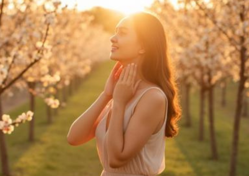 Před západem slunce pořídíme společnou fotografii všech žen – jemnou a silnou vzpomínku na společný čas v rozkvetlém sadu.